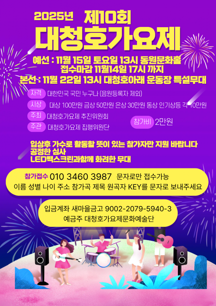 대청호의 아름다운 풍경 속에서 열정과 끼를 펼칠 수 있는 「2025 제10회 대청호가요제」가 열립니다! 노래를 사랑하는 많은 분들의 참여를 기다립니다.